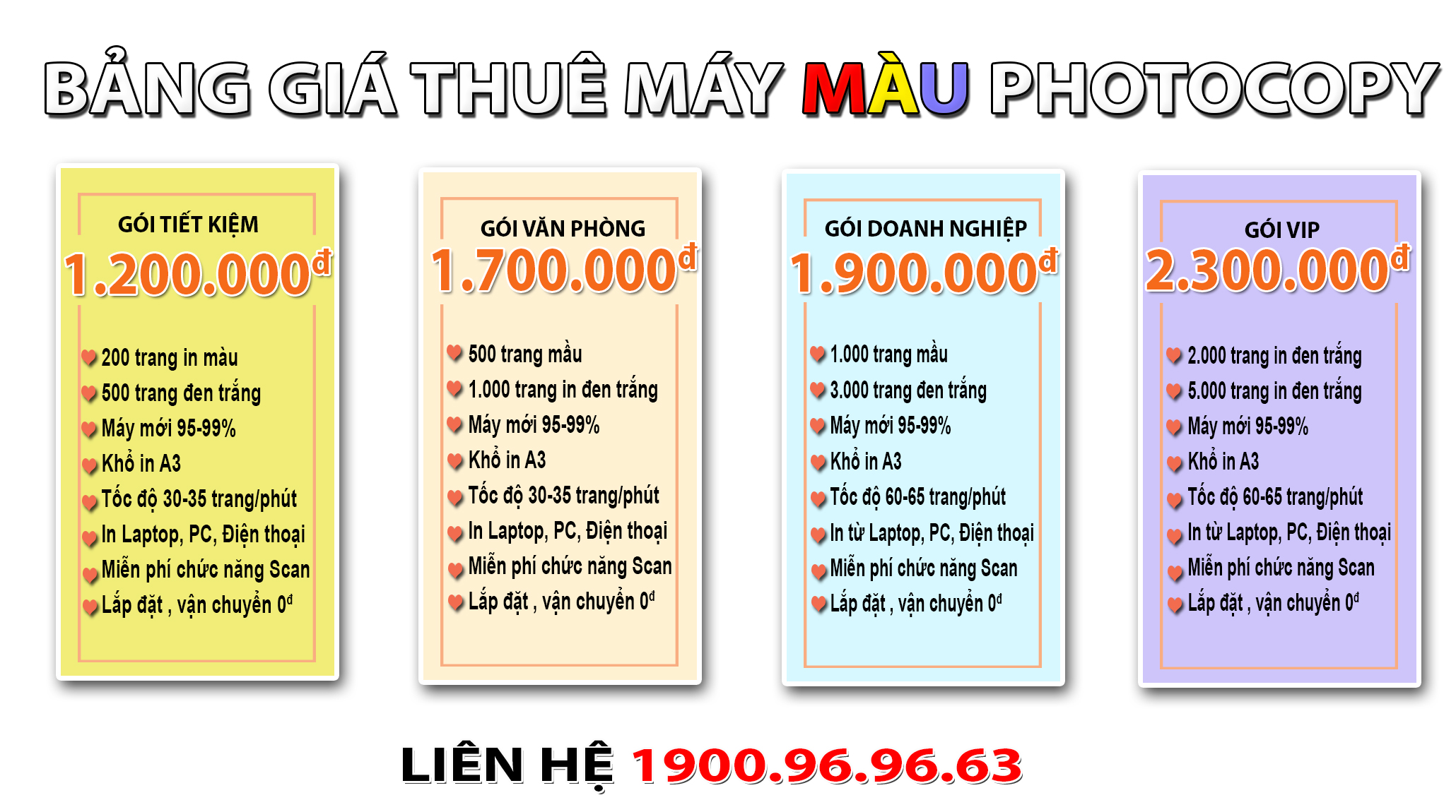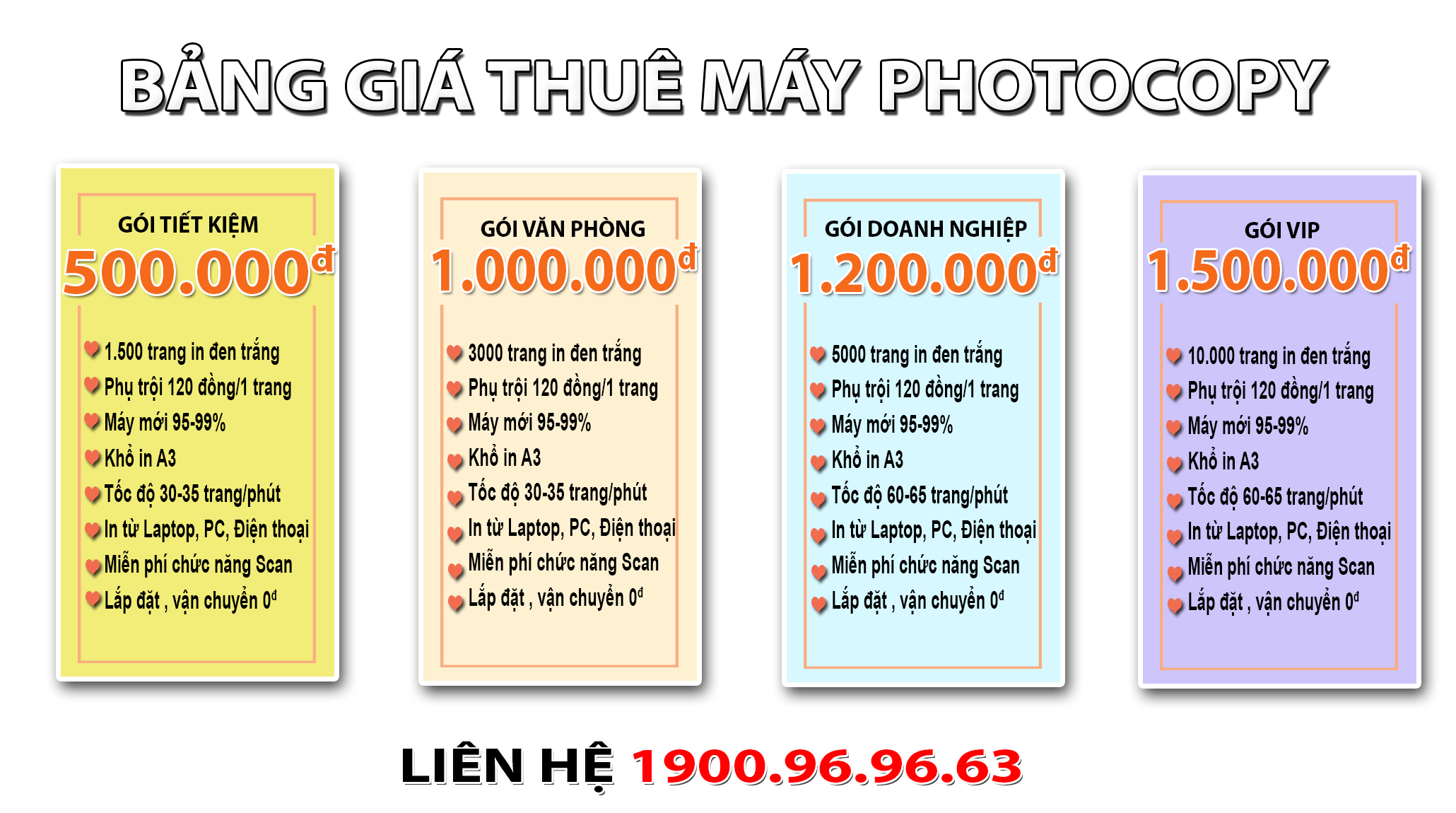 Bạn sẽ không phải trả trước phí thuê, không phải đặt cọc, không lo hết mực phải đổ, không lo máy hỏng hóc phải mất chi phí sửa, không lo nâng cấp và thay thế linh phụ kiện máy photocopy và bạn sẽ được dùng thử máy miễn phí 15 ngày.