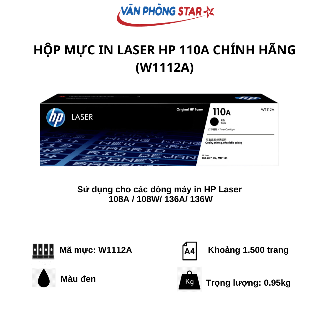 - Hộp mực 110A (W1112A) chính hãng dung lượng khoảng 1.500 bản in được khuyên dùng cho các thiết bị in, đáp ứng được các thông số kĩ thuật chính xác, ít gây mực thừa, tránh lãng phí mực, giúp máy in vận hành bền bỉ hơn. Loại mực này còn khá thân thiện với môi trường và an toàn cho người sử dụng vì nguyên liệu của có thể tái chế nên tránh gây hại cho môi trường.