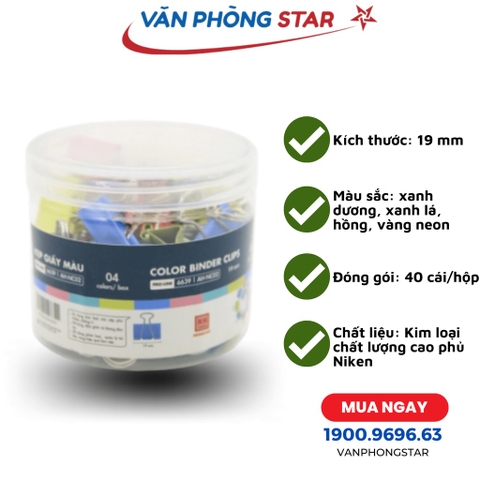 ¸.·’★¸.·’★*·~-.¸-(★ VĂN PHÒNG STAR ★)-,.-~*¸.·’★¸.·’★ »——Kẹp bướm, kẹp giấy màu 19mm (hộp 40 chiếc)——» 🔹 Kích thước: 19 mm 🔹 Màu sắc: xanh dương, xanh lá, hồng, vàng neon 🔹 Đóng gói: 40 cái/hộp; 🔹 Chất liệu: Kim loại chất lượng cao phủ Niken. ◎◎◎◎◎◎◎◎◎◎◎◎◎◎◎◎◎◎◎◎◎◎◎◎◎◎◎◎◎◎ 🔸 Sản xuất từ chất liệu kim loại cao cấp, được phủ Niken chống gỉ giúp kẹp bướm luôn bền đẹp theo thời gian 🔸 Phần lò xo của kẹp linh hoạt, nhẹ, dễ dùng, không bị lỏng hay bung rời sau nhiều lần sử dụng 🔸 Tay cầm chắc chắn, vừa vặn tạo cảm giác thoải mái khi sử dụng 🔸 Đa dạng đủ mọi kích cỡ từ 15 - 51 mm phù hợp với mọi nhu cầu 🔸 Có 4 màu tươi sáng, hợp xu hướng giúp bàn làm việc nhiều màu sắc, khơi gợi cảm hứng và sáng tạo 🔸 Tính ứng dụng cao, dễ sử dụng giúp việc phân loại, bảo quản tài liệu nhẹ nhàng và hiệu quả hơn ──▄▌▐▀▀▀▀▀▀▀▀▀▀▀▀▀▀▀▀▀▀▀▀▀▀▀▌ ▄██▌█ ░ BẢO HÀNH CHÍNH HÃNG 5 NĂM ███▌█▄▄▄▄▄▄ ▄▄▄▄▄▄▄▄▄▄▄▄▄▄ ▄▄▌ ▀❍▀▀▀▀▀❍❍▀▀▀▀ ▀▀▀▀▀▀▀▀❍❍ ▀▀. ◎◎◎◎◎◎◎◎◎◎◎◎◎◎◎◎◎◎◎◎◎◎◎◎◎◎◎◎◎◎ ⭐ VĂN PHÒNGSTAR CAM KẾT: ◾ 100% Sản phẩm chính hãng. ◾ 100% Giá cạnh tranh so với thịtrường ◾ Hỗ trợ tư vấn kỹ thuật 24/7, nhanhchóng chuyên nghiệp ◾ Với bề dày kinh nghiệm hơn 30 năm hoạt động trong lĩnh vực thiết bị máy văn phòng, Văn Phòng Star tự hào có một chỗ đứng vững chắc trên thị trường cũng như là sự tín nhiệm của khách hàng trêntoàn quốc. Khi đến với chúng tôi, các bạn sẽ được trải nhiệm những dịch vụ muasắm và chăm sóc khách hàng đắc lực nhất.