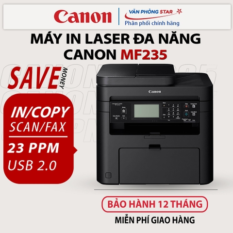 Máy in Canon đa chức năng MF235 được tích hợp đa chức năng: In, Copy, Scan, Fax với tốc độ in lên đến 23 trang/phút cùng chất lượng in hàng đầu là sự lựa chọn cho các văn phòng vừa và nhỏ cần một máy in nhỏ gọn với kinh phí thấp nhưng vẫn đảm bảo khả năng hoạt động đa năng ấn tượng.