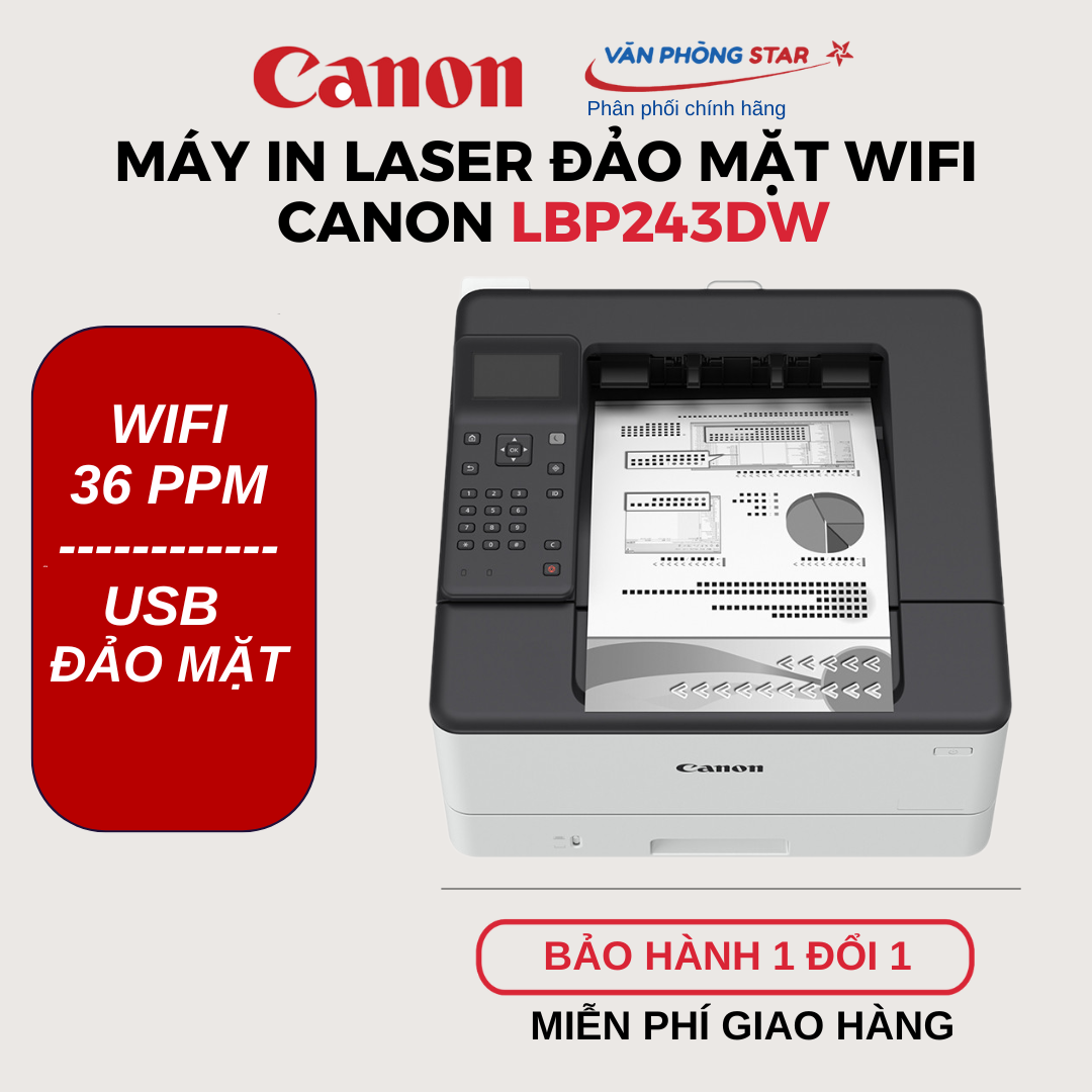 Máy in Canon LBP 243dw là sản phẩm được thiết kế tinh tế, tích hợp sẵn chức năng in hai mặt tự động (Duplex) và kết nối wifi, giúp bạn in ấn nhanh chóng hiệu quả.