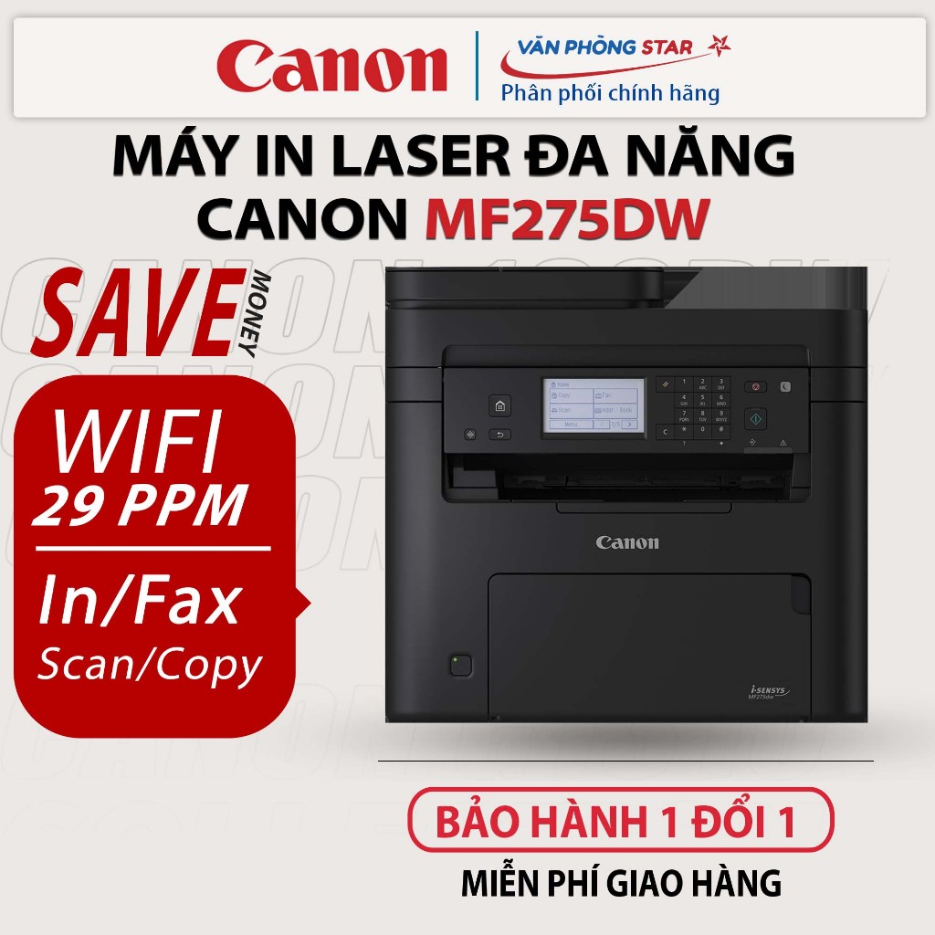 Máy in Laser Canon MF275Dw đa chức năng tích hợp đầy đủ 4 tính năng: Copy, in 2 mặt tự động, scan màu, fax giúp bạn xử lý hầu hết công việc ở văn phòng vừa và nhỏ một cách nhanh chóng và hiệu quả. Hãy cùng Văn Phòng Star tìm hiểu chi tiết về mẫu máy in này bạn nhé.