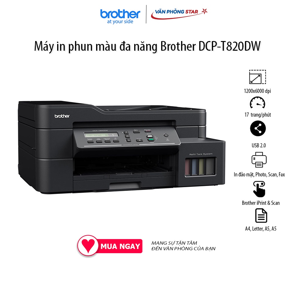 Máy in phun màu đa chức năng Brother DCP-T820DW là giải pháp tiết kiệm chi phí cho gia đình, văn phòng có nhu cầu in số lượng lớn mà vẫn đảm bảo chất lượng in hàng đầu. Brother DCP-T820DW nổi bật với tốc độ in lên đến 16 trang/phút, tích hợp sẵn tính năng in đảo mặt, Copy, Scan, Wifi. Hãy cùng Văn Phòng Star tìm hiểu chi tiết về mẫu máy in này bạn nhé.