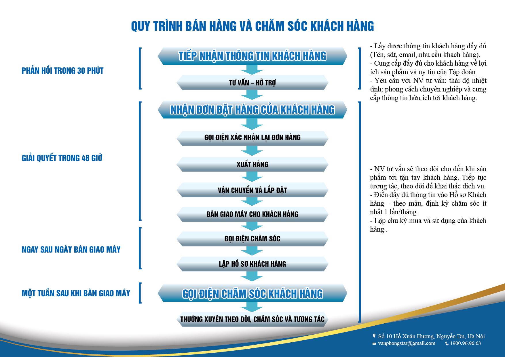 Quy trình bán hàng và chăm sóc khách hàng là quá trình liên hệ với khách hàng tiềm năng để tìm hiểu nhu cầu khách hàng, trình bày và chứng minh sản phẩm, đàm phán mua bán, giao hàng và thanh toán. Quy trình bán hàng của Văn Phòng Star là trình tự các bước thực hiện hoạt động bán hàng đã được tập đoàn quy định hình thành từ rất sớm, mang tính chất bắt buộc, đáp ứng những mục tiêu cụ thể của hoạt động quản trị bán hàng trong tập đoàn từ hàng chục năm qua.